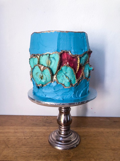 Creating the fault line design itself with a bulky decoration like dried apples was something of a challenge... I'm happy I did it but perhaps in hindsight I should have created narrower cake layers in the mid section of the cake to allow for a more streamlined finish when adding the buttercream. Either way I love the look of those coloured apple slices popping out of the teal buttercream and like I said it was beyond yum!
