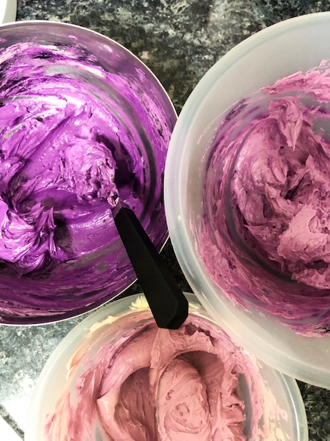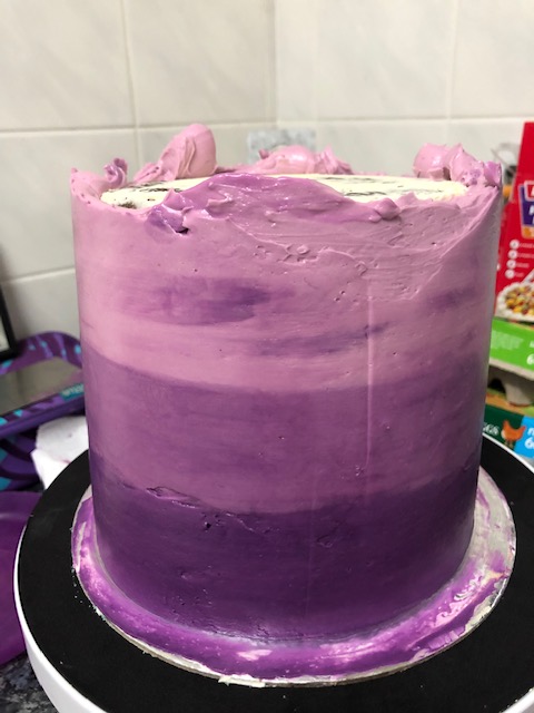 The perfect balance between the two aforementioned icing options, IMBC is equally heavy on butter like SMBC however the method of creating a sugar syrup to make the meringue, in my opinion, infuses the buttercream with a far sweeter taste. So a sweeter option to SMBC but why do I prefer it to American? Simple, the make up of IMBC is much smoother lending a beautiful finish to your cake. See below an IMBC crumb coating (left) and purple ombre (right).
