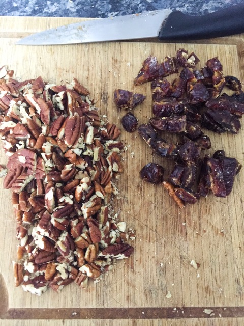 Sprinkle over most of the pecans (save some to top the brownie with) and the dates.